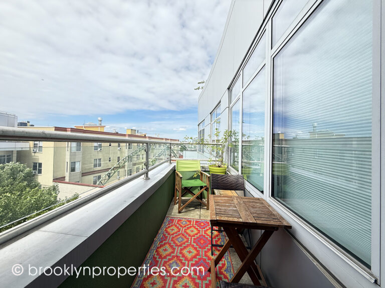 174 Vanderbilt Ave, Apt 606, offers the best of everything. It is a tranquil and inviting two-bedroom, two-bathroom apartment with central AC, a private balcony, stackable washer/dryer and a deeded parking space in the garage below. It is perched on the top floor with treetop views over the interior courtyard, between the two buildings that make up the Clermont Greene Condominium and it benefits from a sunny south exposure in every room.