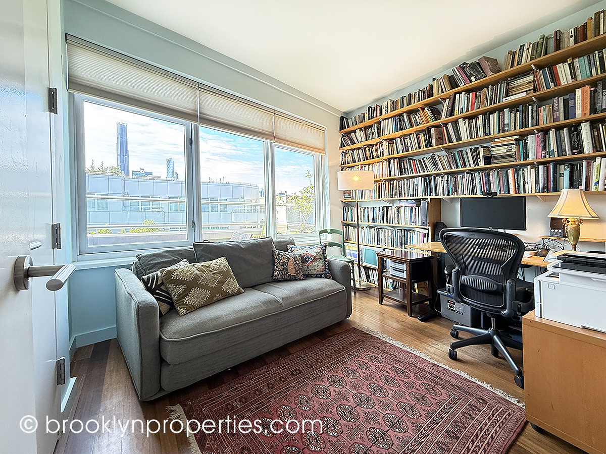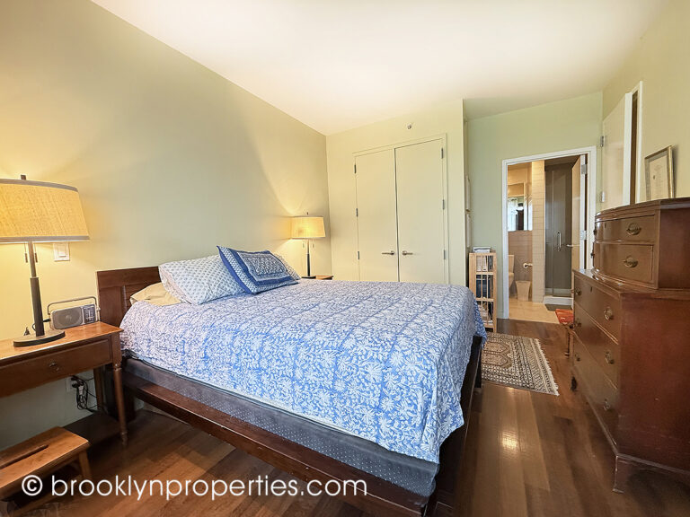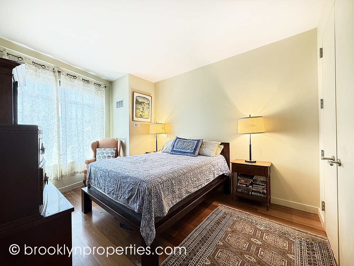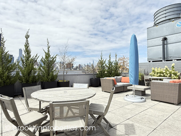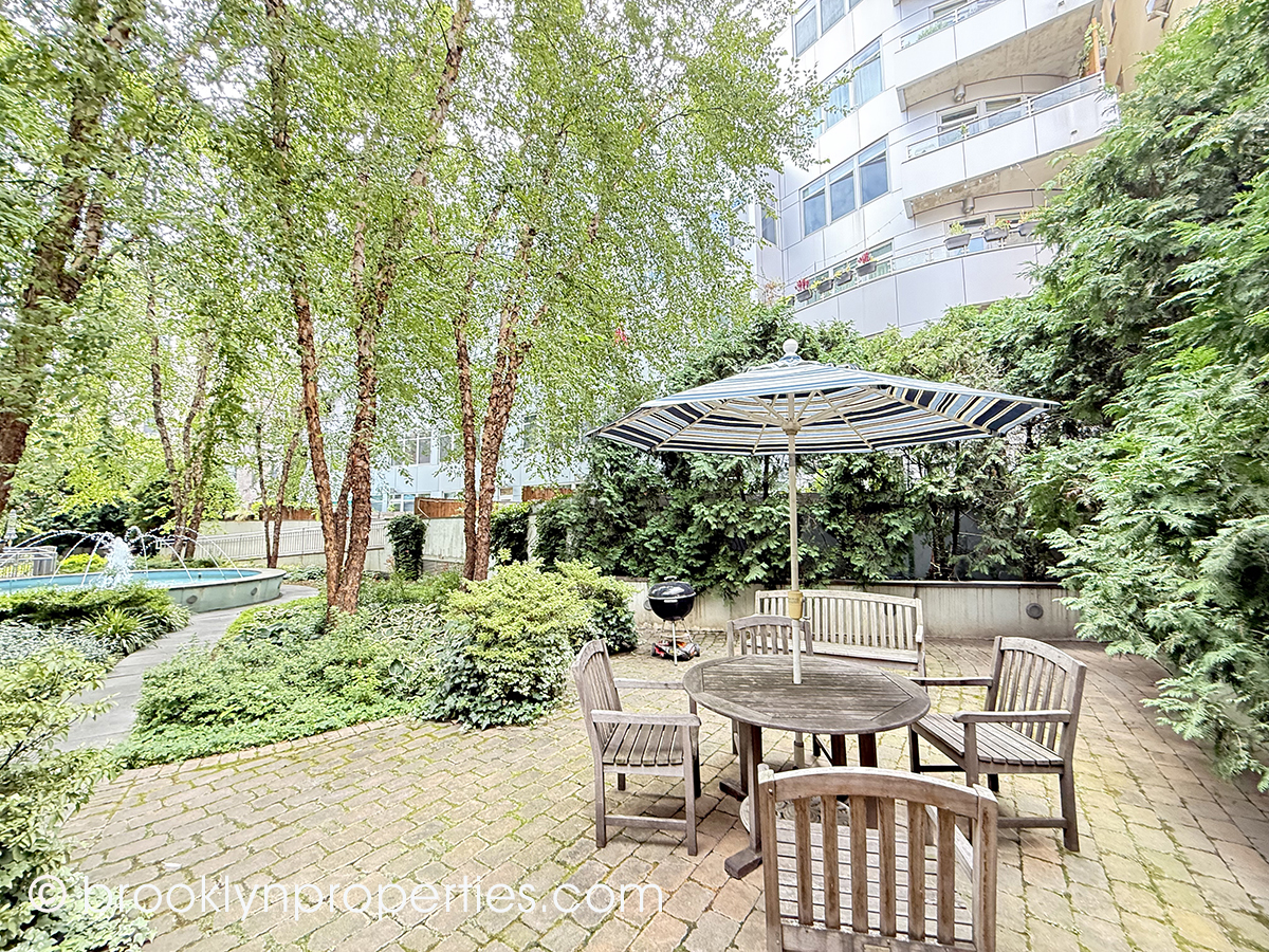 This amenity rich condo offers outdoor space in every shape and size, from the private balcony right off the living room, to the roof deck above with separate furnished seating areas that boast of skyline and river views, to the courtyard below with mature trees and a serene reflecting pool, and designated areas available for hosting a BBQ. There is also a well-stocked gym available for building residents. The doorman provides concierge services from 9:00am to 11:00pm Monday through Friday and there is a package room and cold storage available.
