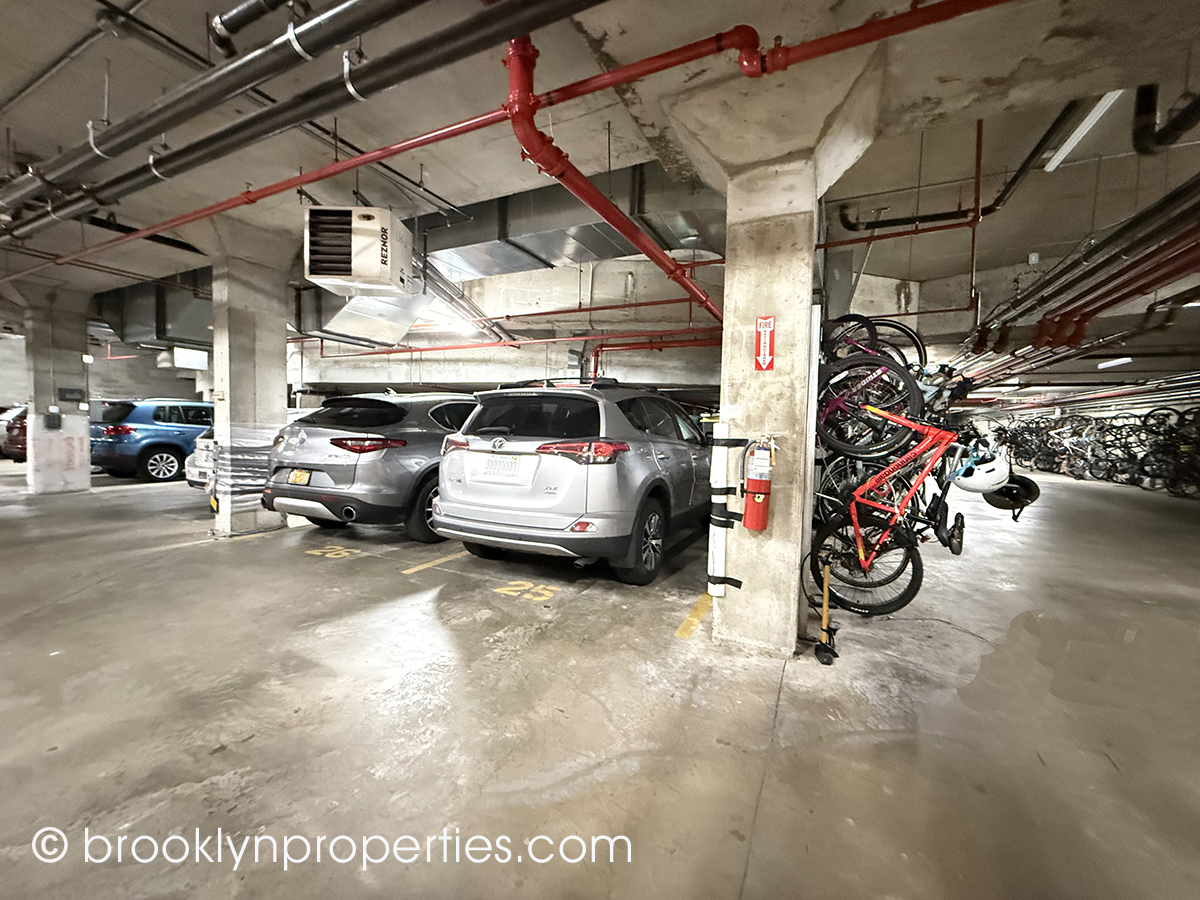 In the hallway you will find the second bathroom and the LG washer and dryer are in the neighboring utility closet. And, there is a coat closet next to the front door. Additional storage space is available within the deeded parking spot, and supplemental private storage units might be available for sale through the condo association. A free bicycle parking space, in the garage, also comes with the apartment.